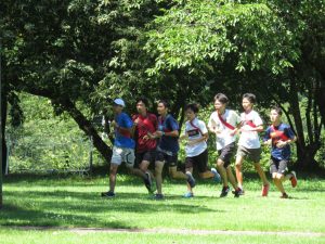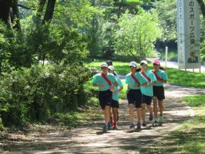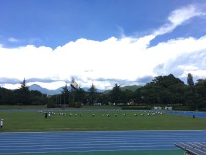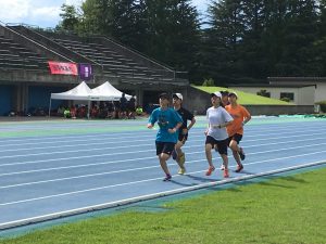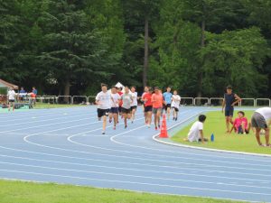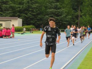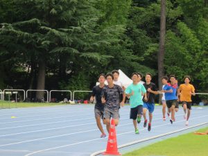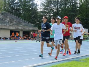 長距離は、午前中に山の斜面にある林間コースを利用したペース走、午後はトラックを利用したインターバルを行いました。林間コースは、木陰が多く舗装された道で、東京にはない爽やかな空気の中を走ることができました。4日目の午後に競技場の外周を利用した駅伝を行いました。男女混合で3チームに分かれて競争し、お互い負けじと全力を尽くしました。その分、チーム戦で勝った喜び、負けた悔しさを大きく感じたようです。