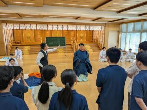 生徒達は初めて見る装束に心躍らせながら、大学生に手伝ってもらって全員が着装の体験をさせていただきました。